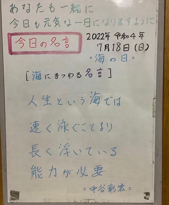 お知らせ #2022年令和4年7月18日 Tweet 2022.07.18 by ヤスイスーパークリーン 京都・太秦のクリーニング店 0 #2022年令和4年7月18日 #海の日 #海にまつわる名言 #人生という海では速く泳ぐことより長く浮いている能力が必要 #中谷彰宏 #京都市 #右京区 #太秦 #花園 #35年の経験知識技術 #生地と汚れに最適のクリーニング #シミ抜き #お直し #丁寧な手仕上げ #クリーニング #ヤスイスーパークリン Facebook