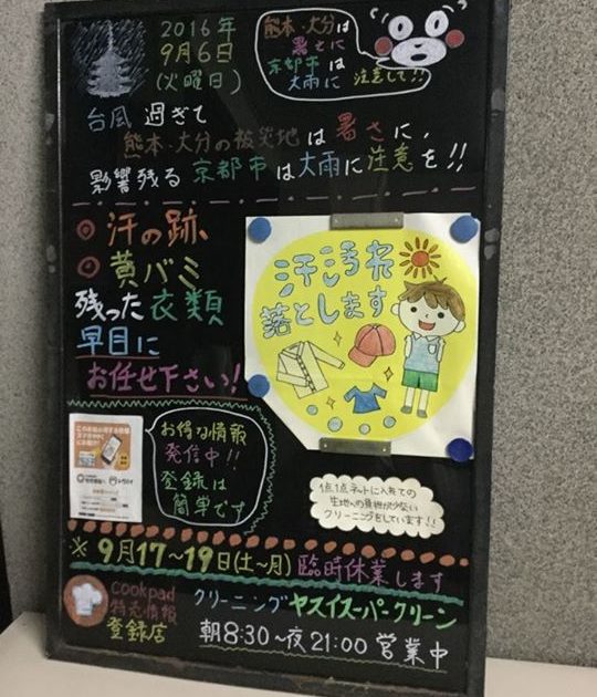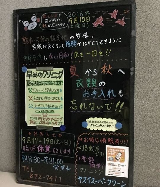 2016年9月9日店頭ブラックボード 今日は日中気温30°Cを超えましたが過ごし易い1日の京都市内でした。あの酷暑の夏から秋に移りつつある… https://t.co/KACunlmGzs