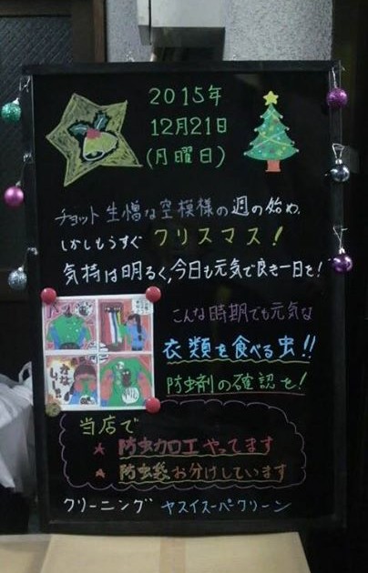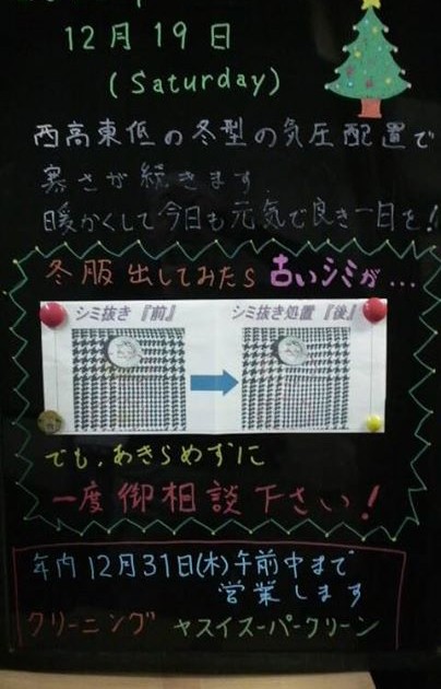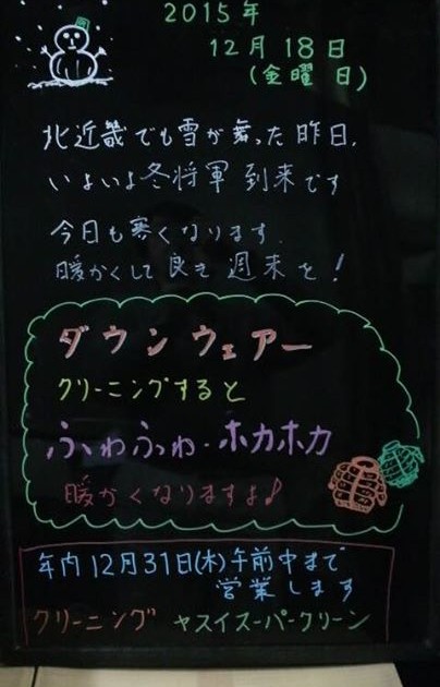 【冬将軍が来ます!冬服、準備出来ていますか?しみ・汚れは早目のお手入れを】 2015/12/16 AM10:45 13℃ 南西の風2.0m/s 曇り気味 数日続いた季節外れの暖かさも今日まで。冬将軍到来、明日からは平年並 […]