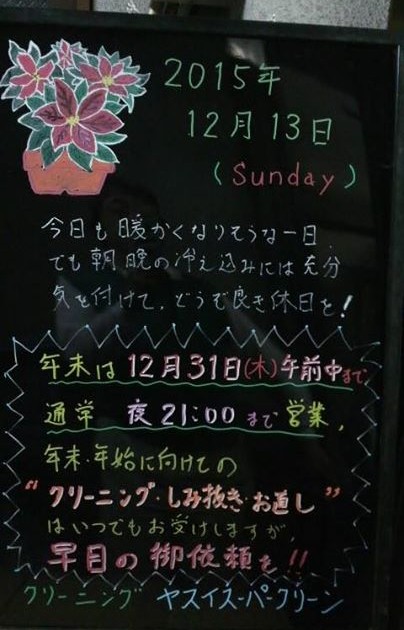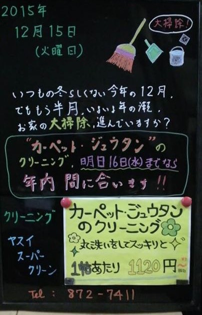 【12月も残り半月、大掃除は進んでますか?カーペット・ジュータンクリーニング明日16日までなら年内間に合います】 2015/12/15 AM11:50 11℃ 西北西の風1.0m/s 晴れ ここまで例年の冬らしくない12 […]
