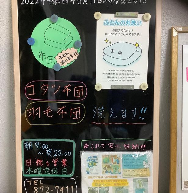 #2022年令和4年5月11日 #毎日更新 #日替わり店頭ブラックボード No.2015 #コタツ布団 #羽毛布団 #布団洗えます❗️ #中綿までスッキリ綺麗に #京都市 #右京区 #太秦 #花園 #35年の経験知識技術 […]
