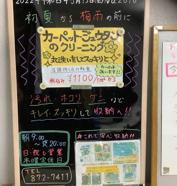 #2022年令和4年5月13日 #毎日更新 #日替わり店頭ブラックボード No.2016 #初夏から梅雨の前に #カーペットも丸洗いクリーニング #汚れ埃ダニ等綺麗スッキリして収納 #京都市 #右京区 #太秦 #花園 # […]