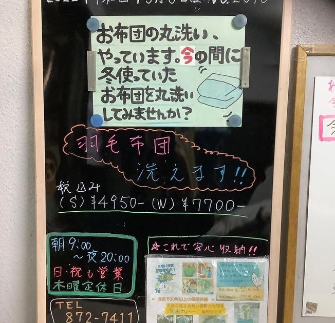 #2022年令和4年5月6日 #毎日更新 #日替わり店頭ブラックボード No.2010 #ここらでお布団の丸洗い #スッキリ気持ち良く❗️ #羽毛布団も洗えます #京都市 #右京区 #太秦 #花園 #35年の経験知識技術 […]