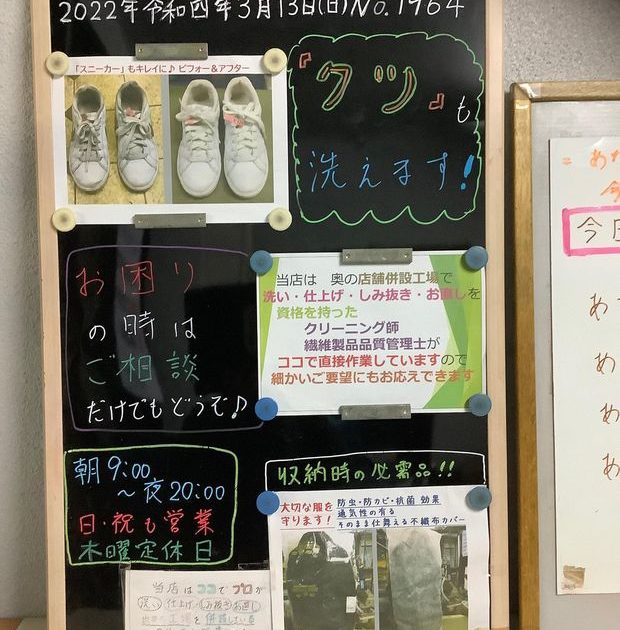 #2022年令和4年3月13日 #毎日更新 #日替わり店頭ブラックボード No.1964 #クツも洗えます‼︎ #スニーカーもキレイに♪ #ご相談だけでもどうぞ #クリーニング師 #繊維製品品質管理士 #京都市 #右京区 […]